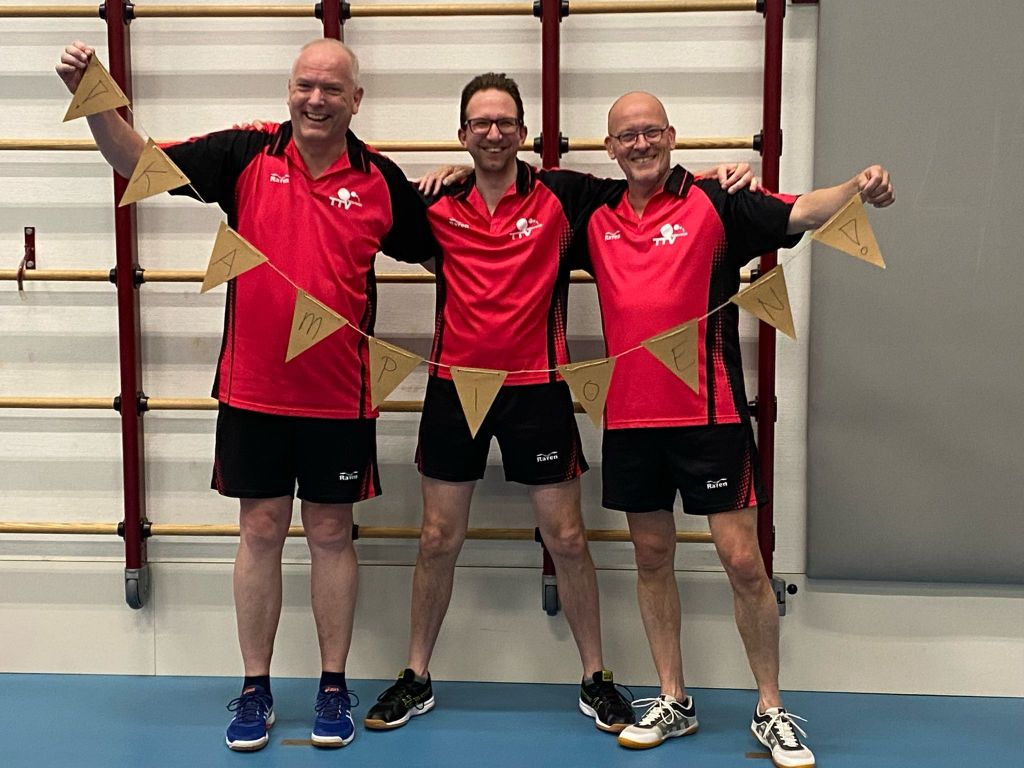 Jaap, Joop A en Norbert speelden thuis tegen Play Fair 1 uit Leimuiden. Een wedstrijd waarvan de mannen tevoren bedacht hadden dat wel wat mogelijk zou moeten zijn. Jaap en Joop begonnen dan ook voortvarend, waarbij Jaap zijn eerste partij in vijf games won en waar Joop er vier nodig had. Norbert wilde niet onderdoen voor zijn teamgenoten, maar verslikte zich in zijn eerste partij door er in drie games niet aan te pas te komen. Dat bleek het begin van een slechte reeks te zijn, want daarna ging de dubbel verloren voor Joop en Norbert in drie games en gingen Jaap en Joop elk in vier games onderuit. Waarna het dus na zes games 2-4 stond voor de gasten uit Leimuiden. Voor Norbert het signaal om alle schroom van zich af te gooien. In de zevende partij rekende hij gedecideerd in vier games af met zijn Leimuidense tegenstandster. Joop had de stand gelijk kunnen trekken, maar ging onderuit in drie pittige games. Norbert en Jaap lieten het er niet bij zitten. Tot op het bot gemotiveerd werden de laatste twee partijen in vijf zware games in Reeuwijks voordeel beslist. Daarmee eindigde Reeuwijk 3 tegen Play Fair1 in een mooie 5-5. Dit heeft evenwel tot gevolg dat Reeuwijk 3 in West 5D, ondanks de 5 punten van deze wedstrijd, onderaan staat met 14 punten uit wedstrijden.